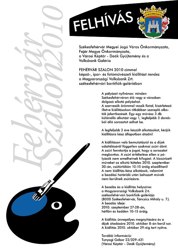 Székesfehérvár és Fejér Megye Önkormányzata, a Városi Képtár - Deák Gyűjtemény, illetve a Volksbank Galéria Fehérvár Szalon 2010 címmel képző-, ipar- és fotóművészeti kiállítást rendez a Magyarországi Volksbank Zrt. székesfehérvári bankfiók-galériában. A pályázat nyilvános: minden Székesfehérváron élő vagy a városban dolgozó alkotó pályázhat. A szervezők örömmel veszik fiatal, kísérletező illetve kiállításokon ritkábban szereplő alkotók jelentkezését.