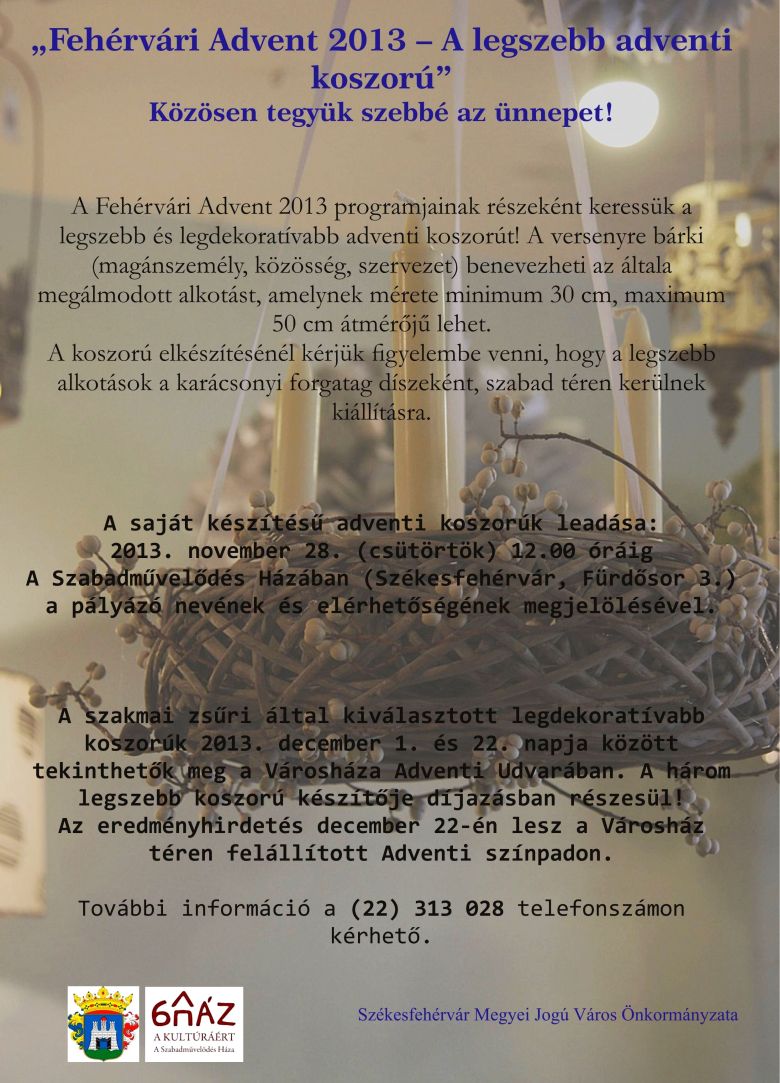 A Fehérvári Advent 2013 programjainak részeként a város önkormányzata keresi a legszebb és legdekoratívabb adventi koszorút! A versenyre bárki - magánszemély, közösség, szervezet - benevezheti az általa megálmodott alkotást, amelynek mérete minimum 30 cm, maximum 50 cm átmérőjű lehet. További információ a (22) 313 028 telefonszámon kérhető.