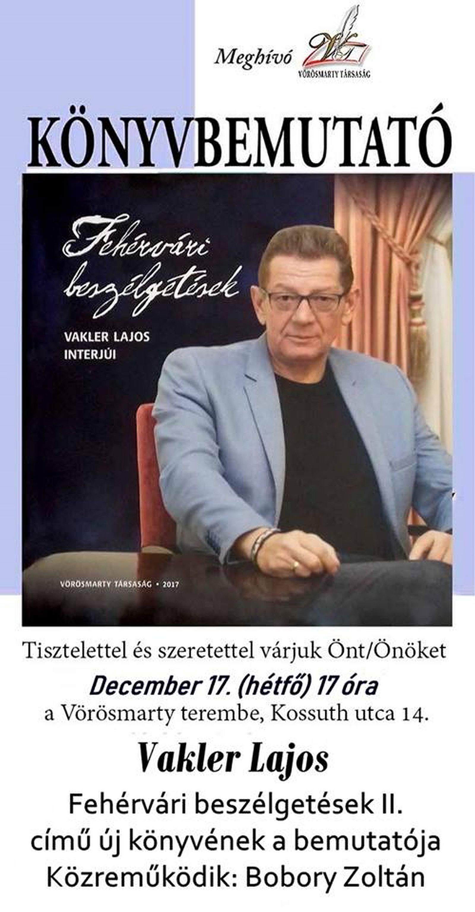 December 17-én, hétfőn 17 órakor lesz Vakler Lajos, Penna Regia-díjas és Prima Primissima-különdíjas újságíró Fehérvári beszélgetések II. című kötetének bemutatója a Vörösmarty teremben. (Kossuth utca 14.) A könyv újabb válogatás a város közösségében meghatározó személyekkel készült beszélgetésekből; élvezetes és hiteles olvasmány, amely „lelkünk épületét” szolgálja.