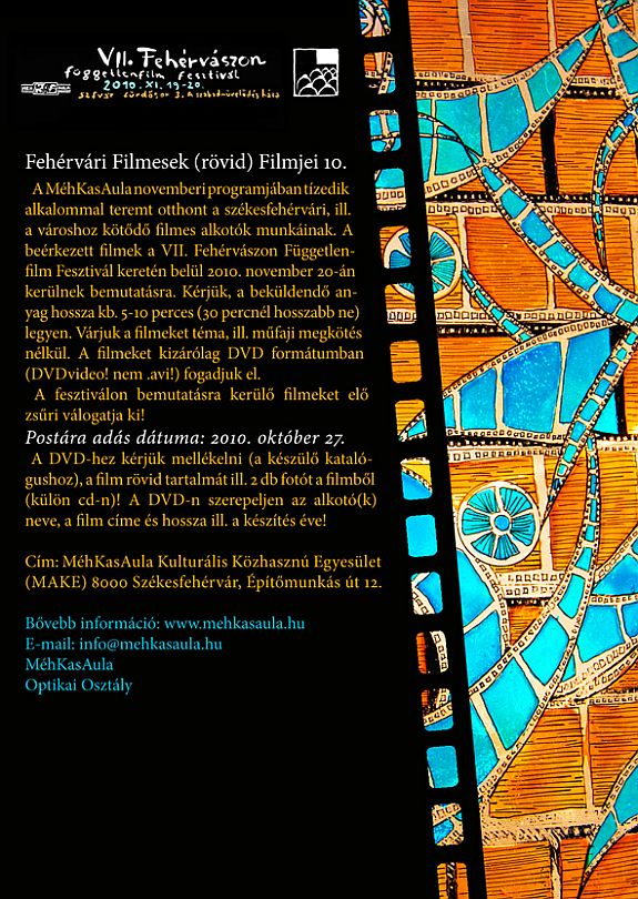 A MéhKasAula novemberben tizedik alkalommal teremt lehetőséget a székesfehérvári, illetve a városhoz kötődő filmes alkotóknak. A beérkezett filmek a VII. Fehérvászon Függetlenfilm Fesztivál keretén belül 2010. november 20-án kerülnek bemutatásra. A filmeket téma, illetve műfaji megkötés nélkül várják DVD formátumban. A fesztiválon a bemutatásra kerülő filmeket elő zsűri válogatja ki.