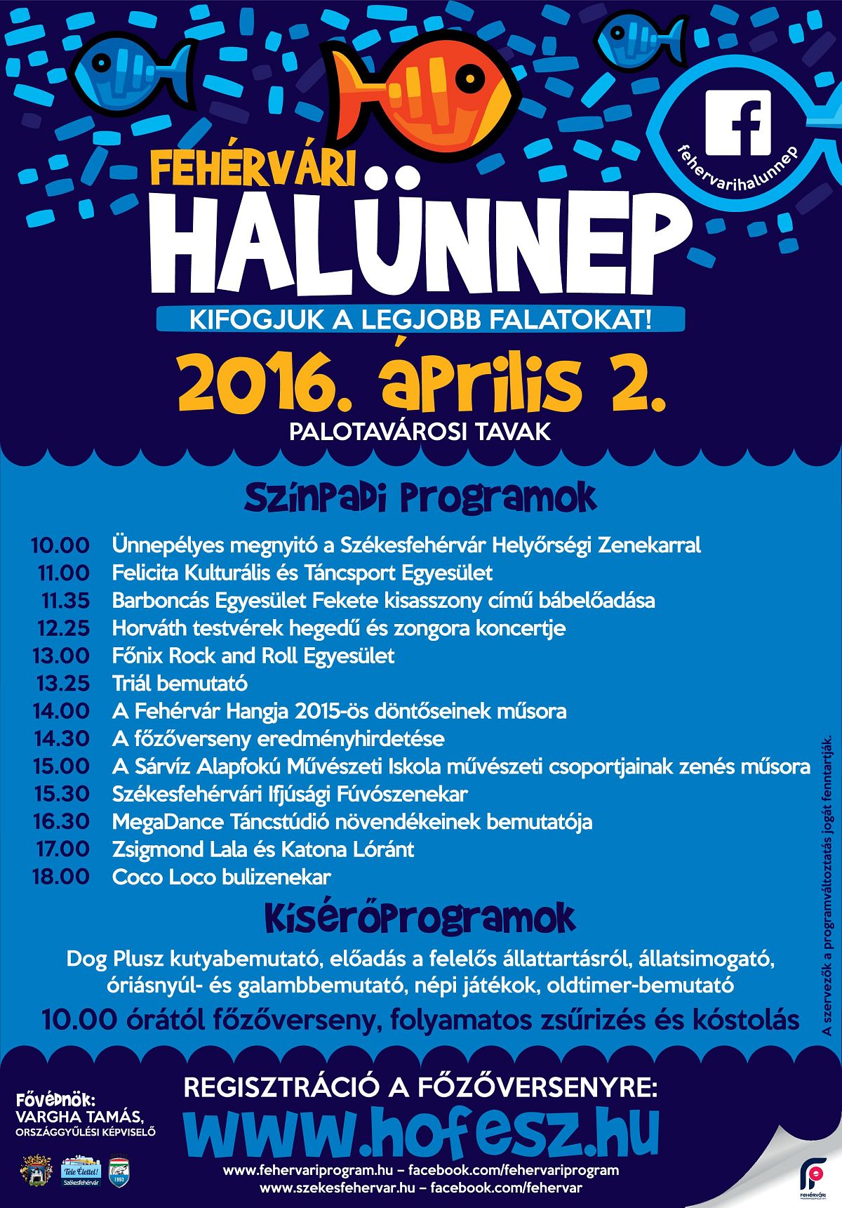 Idén már negyedik alkalommal várják a közönséget jó falatokkal és szórakoztató programokkal április 2-án szombaton a Fehérvári Halünnepen. A rendezvényen főzőverseny és megannyi színpadi program is várja az érdeklődőket. A kísérőprogramok között óriásnyúl és galambbemutató is szerepel. A főzőversenyre a www.hofesz.hu oldalon lehet regisztrálni.