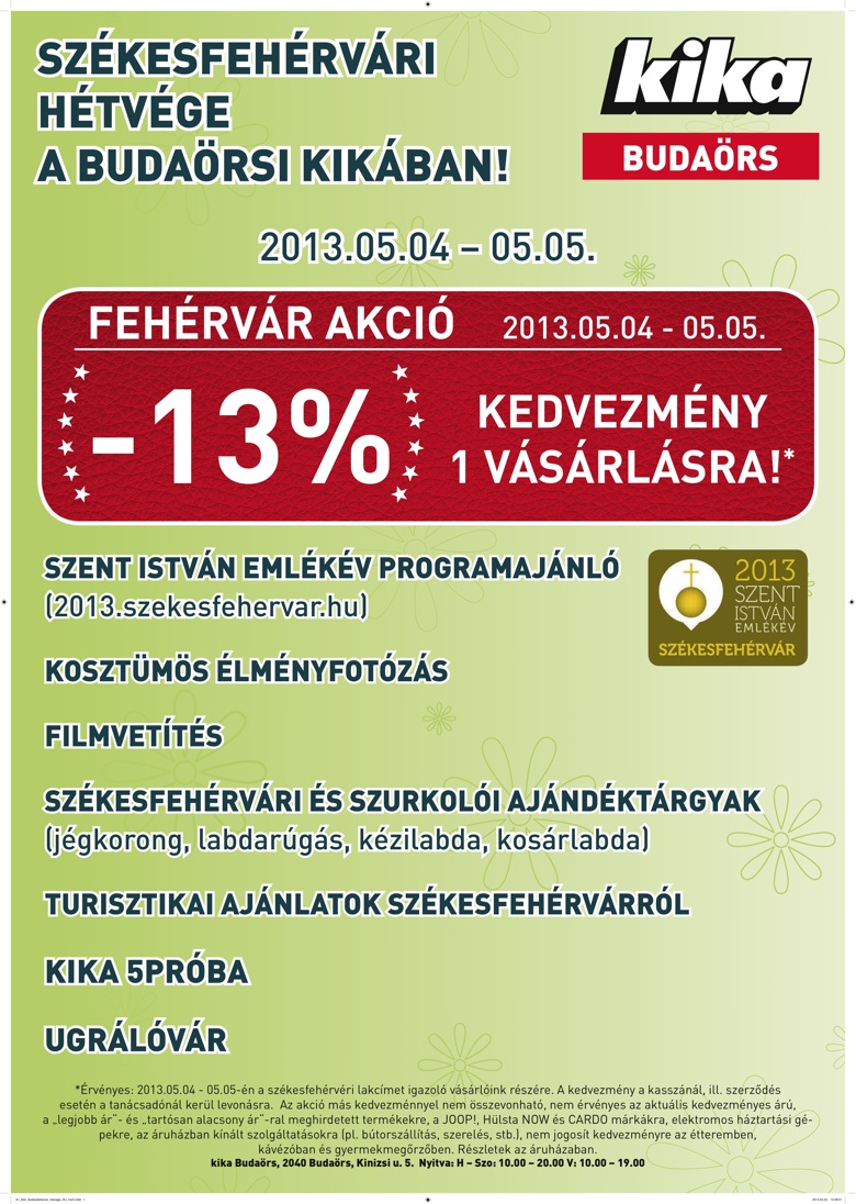 Székesfehérvári Hétvégét rendeznek május 4-én és 5-én a budaörsi Kika áruházban. Lakcímkártya bemutatásával a fehérvári lakosok egy vásárlásra jogosító 13%-os kedvezményt kapnak, a város önkormányzata és a cég együttműködésének köszönhetően pedig a más településekről érkező vásárlók is megismerhetik a 2013-as Szent István Emlékév programjait.