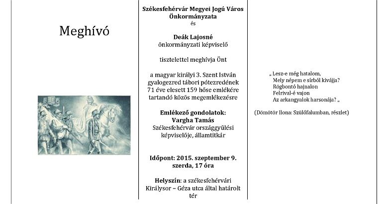 Székesfehérvár Önkormányzata megemlékezéssel egybekötött tiszteletadást szervez szeptember 9-én, szerdán 17.00 órakor a Gyergyó emlékparkban. Az eseményen részt vesz Deák Lajosné önkormányzati képviselő és Vargha Tamás honvédelmi államtitkár, országgyűlési képviselő. A megemlékezésre tisztelettel várnak minden érdeklődőt!