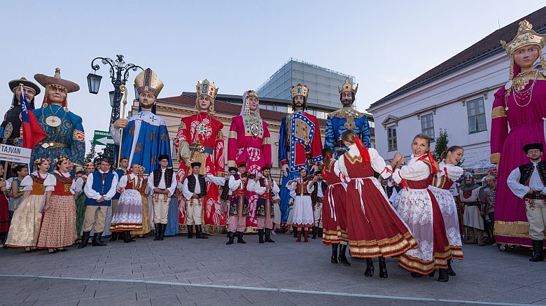 A menet megáll majd a Szabadságharcos út - Mészöly Géza út kereszteződésében, a Zichy liget - Fő utca – Magyar Király előtti téren és a a Fő utcán a Mátyás emlékműnél is, a megállókban a néptáncosok táncolnak, énekelnek, az óriásbábok pedig körbe forogva integetnek a közönségnek. A menet a Szent István térre érkezve részt vesz az ünnepi közgyűlésen és főhajtással teszik tiszteletüket a Szent István szobornál. Az ünnepi közgyűlés után az óriásbábok és hagyományőrzők visszavonulnak a Vörösmarty Színházhoz a Szent István tér-Kossuth u. - Fő utca - Vörösmarty Színház útvonalon.