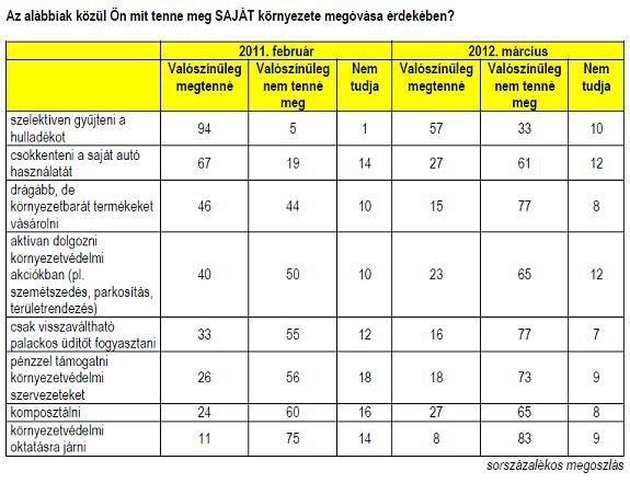 Ha összehasonlítjuk az adatokat az egy évvel korábbi eredményekkel, nagyarányú visszaesést láthatunk a környezetvédelmi aktivitást tekintve egy kategóriát kivéve, a komposztálás iránt az elmúlt egy évben valamelyest nőtt az érdeklődés a fehérvári lakosok között.