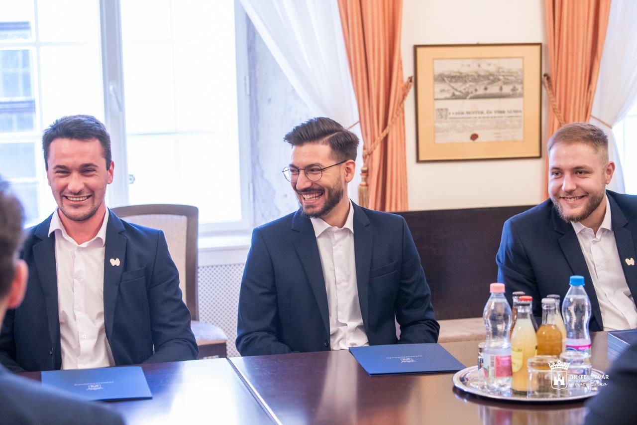 A kiemelkedő teljesítményt nyújtó fiatalokat pénteken kora délután fogadta a Városházán dr. Cser-Palkovics András polgármester, aki Mészáros Attila alpolgármesterrel közösen egy-egy emléklappal köszöntötte őket a város nevében.
