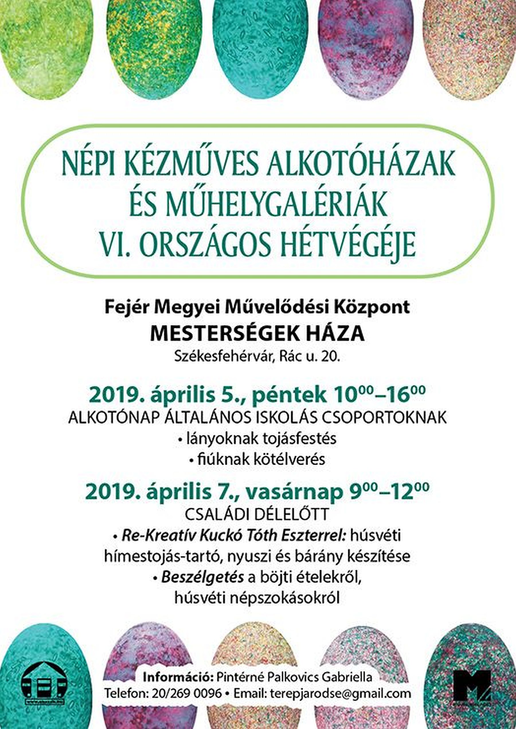 Az országos rendezvény keretében a Rác utca 20. szám alatt található Mesterségek Háza alkotónapra várja az általános iskolásokat április 5-én, pénteken 10-16 óra között: a lányokat a tojásfestés hagyományos módjaiba, a fiúkat pedig a kötélverés rejtelmeibe vezetik be. Április 7-én, vasárnap 9–12 óra között a nemrég indult Re-Kreatív Kuckó következő családi délelőttjén vehetnek részt a kézművesség kedvelői: húsvéti hímestojás-tartó, nyuszi és bárány készítése lesz napirenden Tóth Eszter irányításával, és a résztvevők a böjti ételekről, a húsvéti népszokásokról is hallhatnak majd.