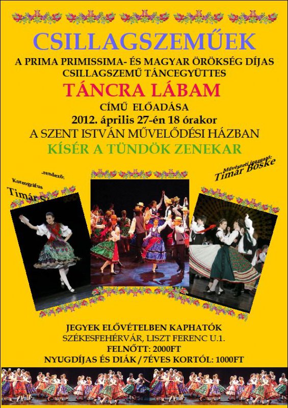 "Táncra lábam" című előadásával érkezik Székesfehérvárra a Prima Primissima- és Magyar Örökség-díjas Csillagszeműek Táncegyüttes. Az eseményre április 27-én, pénteken 18 órától kerül sor a Szent István Művelődési Házban, kísér a Tündök Zenekar. A táncegyüttest Timár Sándor koreográfus és Timár Böske táncművész hozták létre 1993-ban. Az egyedülállóan nagy, 600 fős társulatban már 3 éves kortól tanulják a gyermekek a magyar néptáncot és népzenét.
