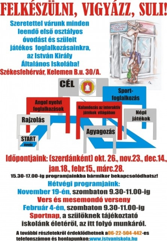 A „Felkészülni, vigyázz, suli!” című foglalkozás-sorozatra a végzős óvodásokat és szüleiket várják. A leendő első osztályos gyerekek részt vehetnek népi és interaktív játékokon, agyagozáson, sportfoglalkozáson. Havonta egy-egy ilyen napra kerül sor, a következőt október 26-án, szerdán tartják 15.30 órától. Az Istvánosok angol nyelvi felkészítőket is szerveznek szerdánként 16.00 órától, ugyancsak a végzős ovisoknak. A gyerekek játékos módon ismerkednek az idegen nyelvvel.