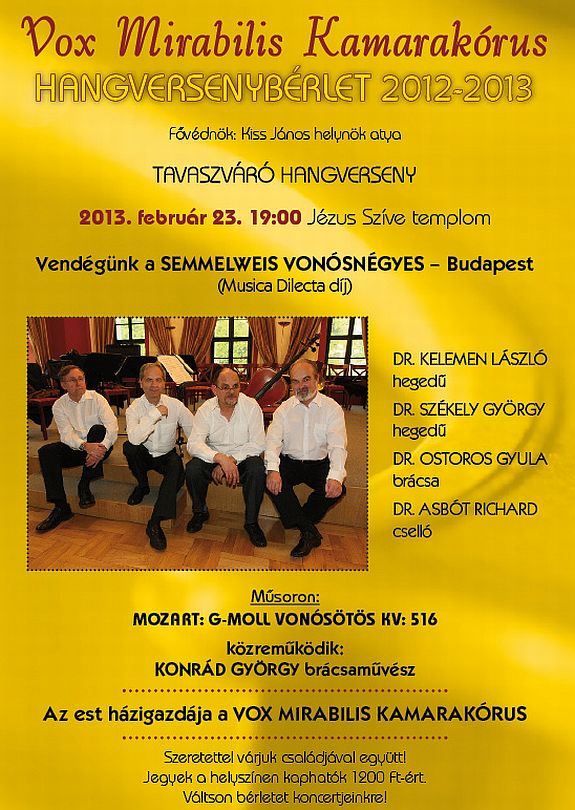 A Musica Dilecta díjas Semmelweis vonósnégyes lesz a Vox Mirabilis Kamarakórus vendége február 23-án, szombaton a Jézus Szíve templomban. A tavaszváró hangversenyen többek között Mozart G-moll vonósötöse is felcsendül Konrád György brácsaművész közreműködésével. A koncertre jegyek a helyszínen kaphatók 1200 Forintért.