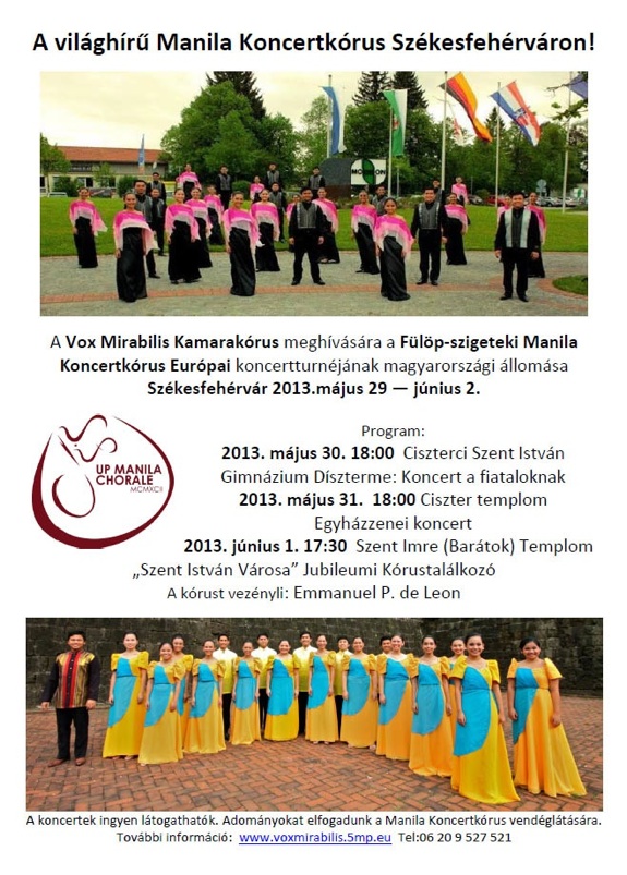 Május 29-től június 2-ig tartózkodik városunkban a világhírű Fülöp-szigeteki Manila Koncertkórus. Európai koncert turnéjuk magyarországi állomása Székesfehérvár, ahol a Jubileumi Év alkalmával több koncertet is adnak. Számos világversenyen az elsők között végeztek, különdíjakat és közönségdíjakat nyertek.