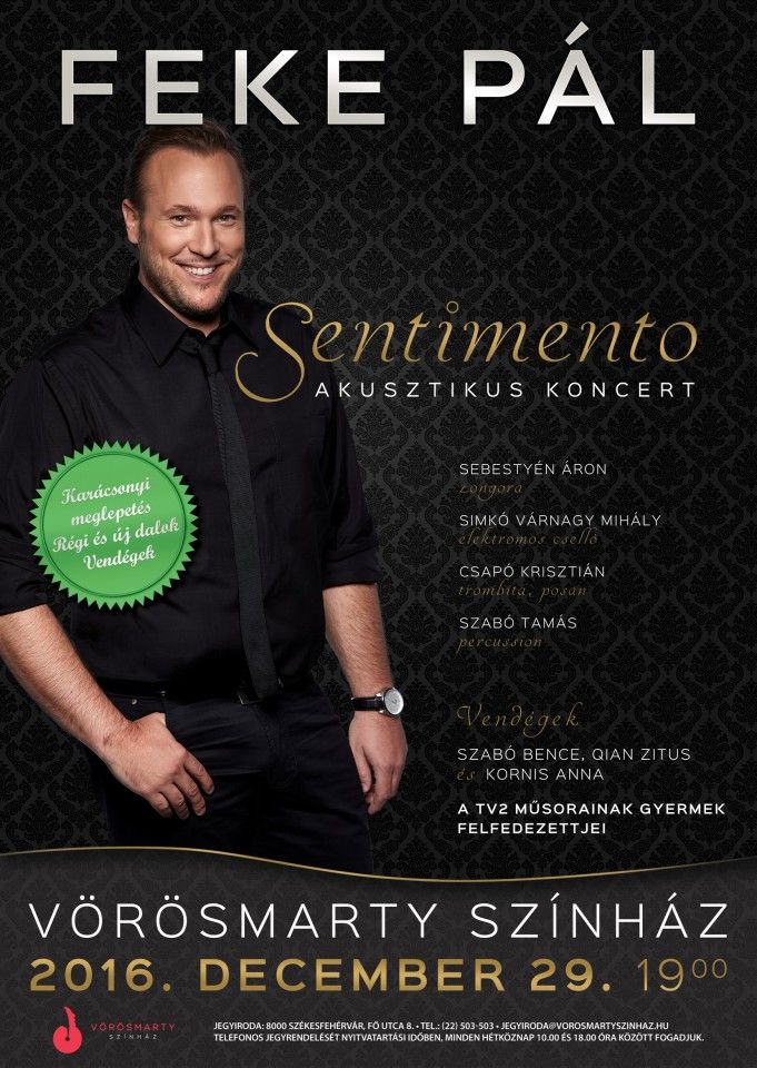 December 29-én 19 órától a Vörösmarty Színház nagyszínpadán Sentimento címmel Feke Pál meglepetésekkel teli koncertjét hallhatja a közönség. Lesznek karácsonyi dalok, vendégénekesek, régi és új slágerek és a Feke Páltól megszokott közkdevelt musicalrészletek. Az esten közreműködnek a TV2 műsorainak gyermekfelfedezettjei, Szabó Bence, Qian Zitus és Kornis Anna is.