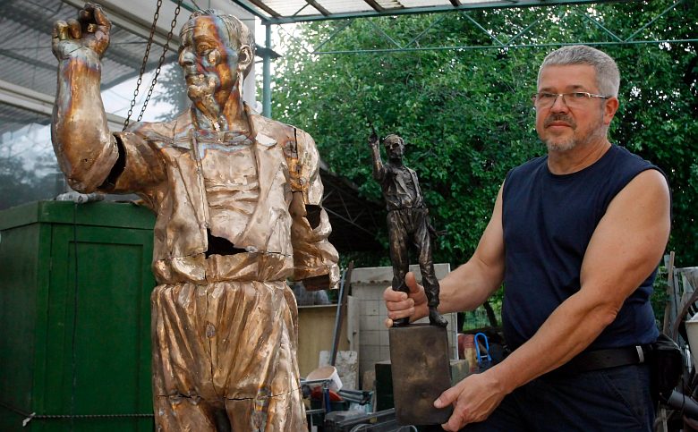 Pogány Gábor Benő szobrászművész a még készülő Aba-Novák Vilmos szoborral és annak makettjével.