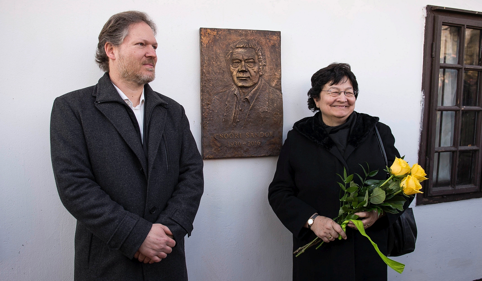 Kontur András szobrászművész (b), a dombormű alkotója és Balogh Júlia, Csoóri Sándor özvegye, a Csoóri-dombormű avatásán, kétszeres Kossuth-díjas költő, író születésének évfordulója alkalmából tartott rendezvényen a Gárdonyi Géza Emlékháznál 2017. február 4-én. MTI Fotó: Bodnár Boglárka