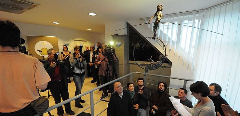 Az ügyvezető ezután Kocsis Balázs szobrászművész, Pondera, vagyis egyensúly című alkotását leplezte el, amely egy kötéltáncost és egy szorgalmasan jegyzetelő figurát ábrázol.