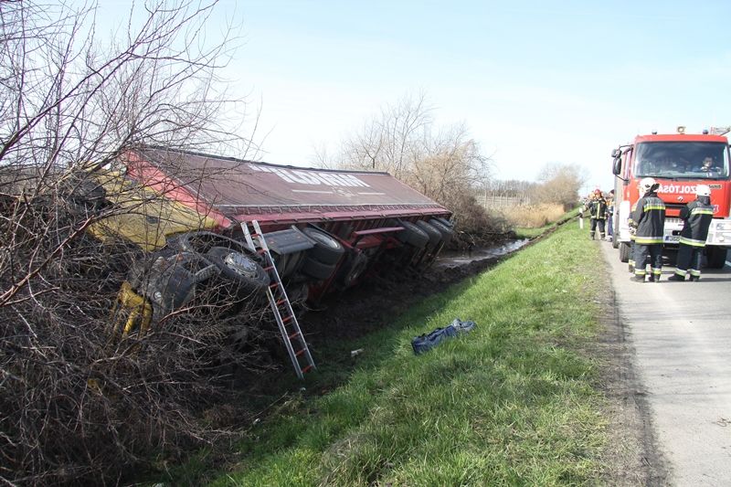 Bokrok közé borult egy nyerges vontató kedden reggel az M7-es autópályán. A Budapest felé haladó kamion Székesfehérvár és Pákozd között jobbra lehajtott a sztrádáról, és a vízelvezető árokban az oldalára borult.