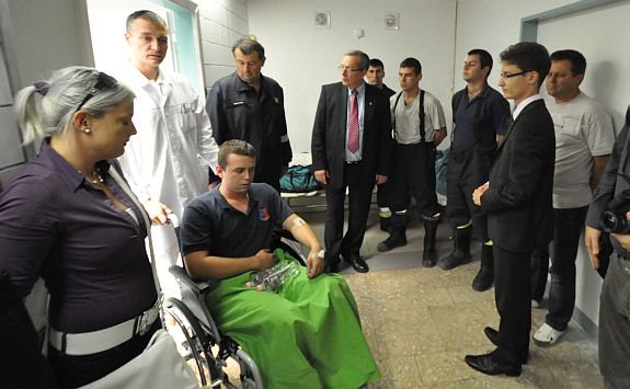 ![]() Dr. Bakondi György, a BM Országos Katasztrófavédelmi Főigazgatóság főigazgatója és dr. Cser-Palkovics András, Székesfehérvár polgármestere délután meglátogatta a Fejér Megyei Szent György Kórházban balesetben megsérült fehérvári tűzoltókat. Kiemelték, hogy a kórház orvosai mindent megtesznek, hogy mihamarabb felépüljenek a tűzoltók. A legsúlyosabban az autó sofőrje sérült meg, neki több helyen eltörött a bordája, állapota stabil. Két további sérültet megfigyelésre azonban szintén a kórházban tartanak. A tűzoltóautó egy tűzesethez sietett, amikor egy kanyarban megcsúszott és a jobb oldalára borult.