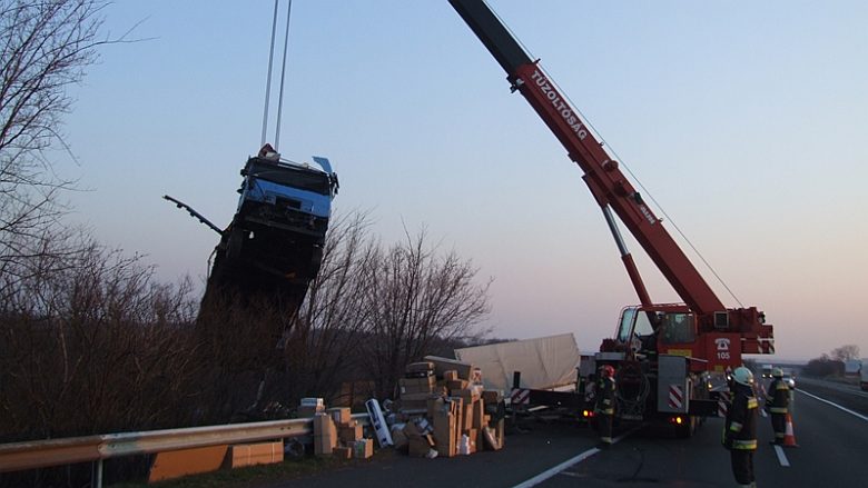 Pénteken hajnalban, az M7-es autópályán a Balaton felé haladó pótkocsis teherautó Szabadbattyán mellett letért a sztrádáról, átszakította a szalagkorlátot és az árokba hajtott. A dobozolt csomagokat szállító teherautó az árokban fejtetőre borult, míg a pótkocsi a kerekein maradt. A sofőr ki tudott szállni a vezetőfülkéből, a balesetben nem sérült meg.