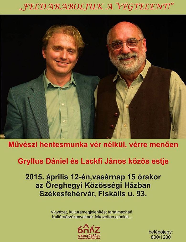 A Költészet Napjához kapcsolódóan vasárnap délután is kulturális programra várnak mindenkit az Öreghegyi Közösségi Házba (Fiskális út 93.). Lackfi János és Gryllus Dániel művészeti hentesmunkát ígér, vér nélkül, vérre menően. Az Öreghegyi Közösségi Ház április 12-i programja kultúra-érzékenyeknek fokozottan ajánlott. Az esemény vasárnap délután 15 órakor kezdődik.