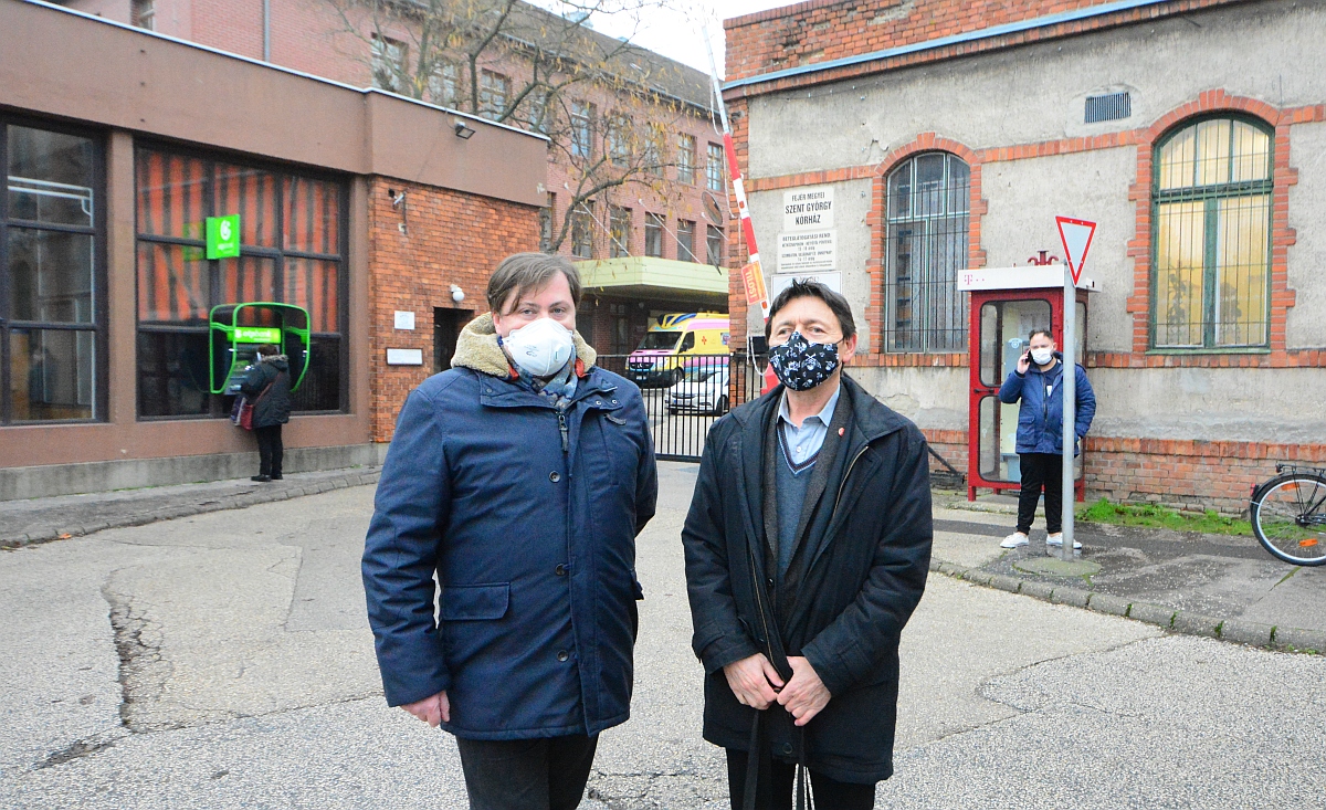 Csütörtökön délután a Noé Hegyi Szent István Borlovagrend nagymestere Dinnyés Ferenc és a borrend tagja Róth Péter alpolgármester közösen adták át jelképesen a borászok adományát a Szent György Kórházban a