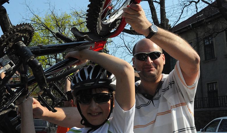 Bodonyi Krisztián és fia Dániel idén tavasszal sem hiányozhatott a biciklis felvonulásról. A tömeg a Halesz parkból indult, majd a Király soron - Rákóczi úton - Várkörúton - Zichy ligeten - Mészöly Géza utcán - Palotai úton - Piac téren - Széchenyi utcán - Horváth István utcán - Lövölde úton és a Budai úton keresztül jutottak vissza a parkba.