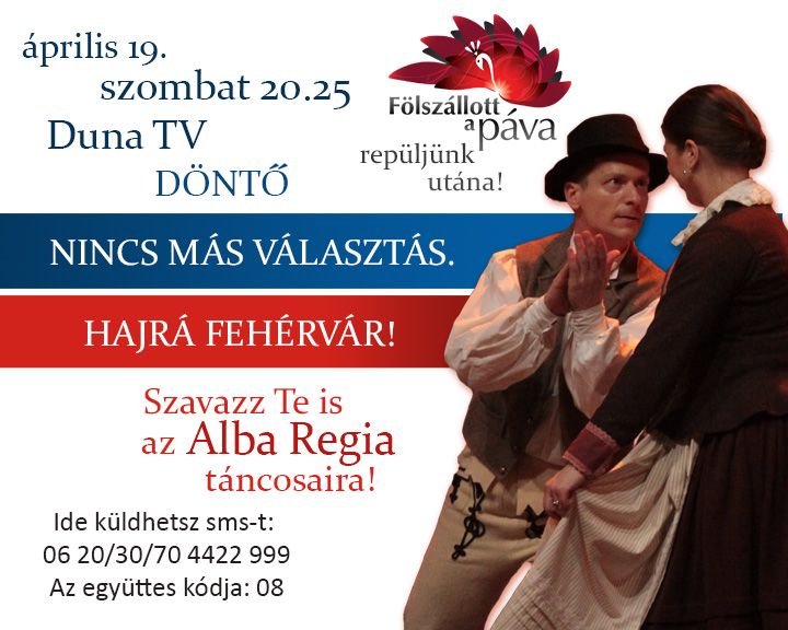 Utolsó megmérettetéséhez érkezik hétvégén az Alba Regia Táncegyüttes, hiszen a középdöntőt követően bejutott a „Fölszállott a páva” döntőjébe. Április 19-én, szombaton 20.25 órakor lépnek színpadra a legjobbak között az MTVA és a Hagyományok Háza közös tehetségkutató műsorában. A középdöntő gyakorlatától eltérően a szavazatokat már a műsor kezdetétől lehet küldeni 06-20/30/70 44 22 999-es telefonszámra. Az Alba Regia Táncegyüttes kódja a döntőben is a 08-as marad.