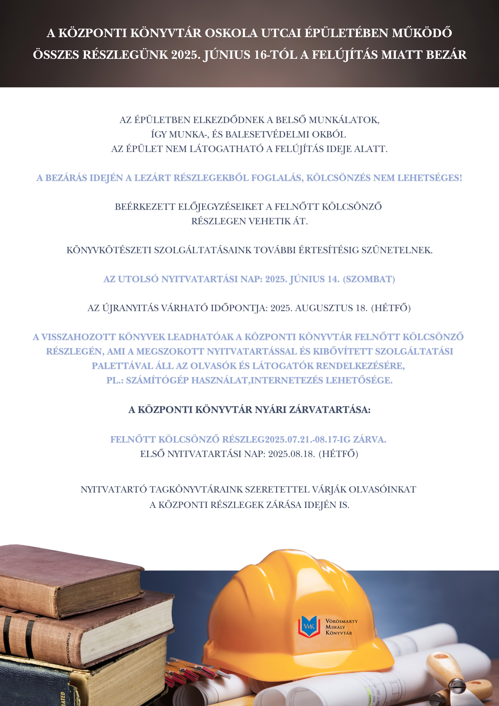 A könyvkötészeti szolgáltatások további értesítésig szünetelnek. A visszahozott könyvek leadhatók a Központi Könyvtár Felnőtt kölcsönző részlegén, ami a megszokott nyitvatartással és kibővített szolgáltatási palettával (számítógép-használat, internetezési lehetőség) áll az olvasók és látogatók rendelkezésére. Az újranyitás várható időpontja augusztus 18-a, hétfő.