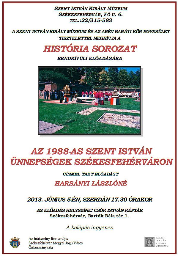 A História sorozat rendkívüli előadása az 1988-as Szent István Emlékévről szóló érdekes, vetítéssel egybekötött program lesz a Csók István Képtárban június 5-én, szerdán. Harsányi Lászlóné előadására a belépés ingyenes lesz.
