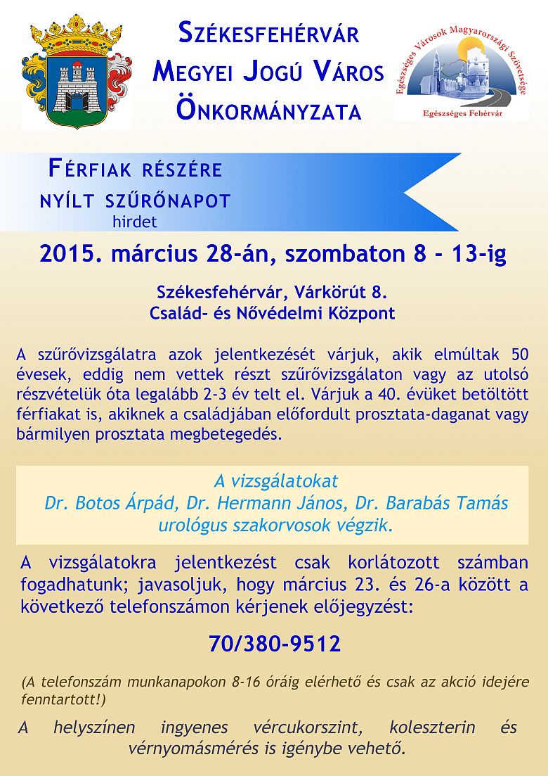 2015. március 28-án, szombaton 8 és 13 óra között várják a férfiakat a Család- és Nővédelmi Központban (Várkörút 8.). Elsősorban azokra számítanak, akik elmúltak 50 évesek és eddig nem vettek részt szűrővizsgálaton, vagy az utolsó részvételük óta eltelt legalább 2-3 év. Várják azokat a 40. évüket betöltött férfiakat is, akiknek családjában előfordult prosztatadaganat. A vizsgálatok ingyenesek, de előzetes bejelentkezéshez kötöttek. Előjegyzés március 23-ától 26-áig a 70/380 9512-es telefonszámon kérhető, amely naponta 8-16 óra között hívható.