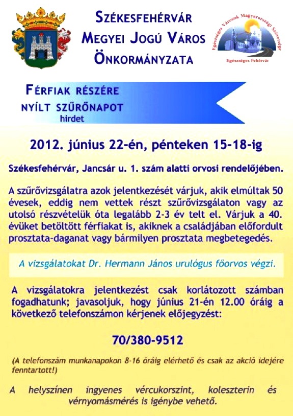 A nyílt szűrőnap kapcsán Östör Annamária egészségügyi tanácsnok elmondta, hogy elsősorban azokat szeretnék megszólítani, akik eddig kevésbé törődtek egészségükkel és nem vettek részt hasonló vizsgálatokon. Várják a 40. életévüket betöltött férfiakat is, akiknek a családjában előfordult prosztata-daganat, vagy bármilyen proszatat megbetegedés. A vizsgálatokat Dr. Hermann János urulógus főorvos végzi, aki elrettentő statisztikai adatokról számolt be a szűrőnap sajtótájékoztatóján. 2007-ben az urulógia osztályon 680 műtétet hajtottak végre nem daganat miatt és 300 férfit műtöttek daganattal. 2011-ben 670 volt a nem daganat miatti műtét és közel 500 rákos beteget műtöttek. Négy év alatt tehát közel kétszeresére emelkedett a daganat miatt végzett műtétek száma.