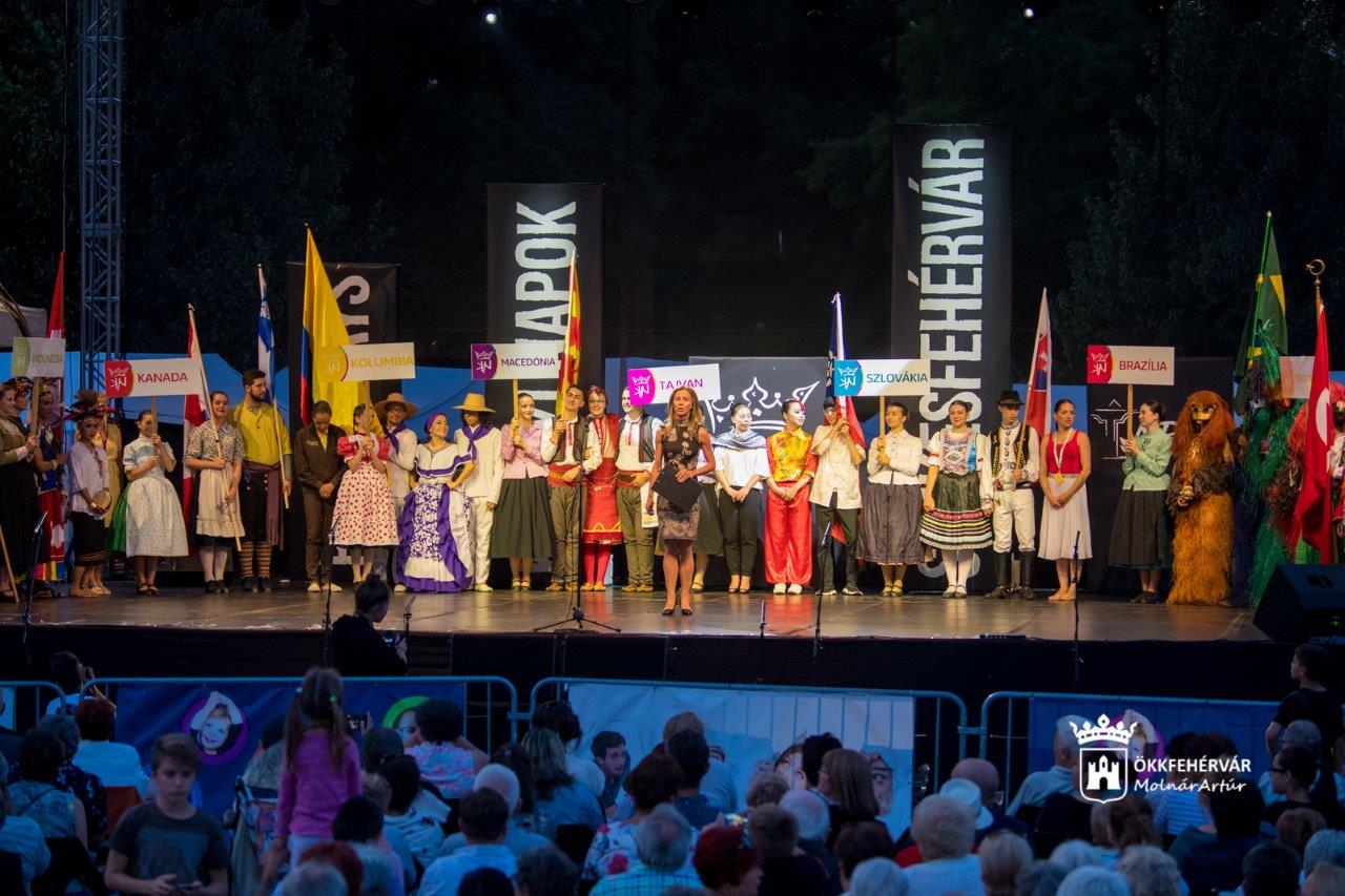 Színpompás nemzeti kosztümök, töröksípok, hegedűk, dobok, ének, tánc, mosoly és taps töltötték meg a Belvárost a Székesfehérvári Királyi Napok keretében XXIV. alkalommal megrendezett Nemzetközi Néptáncfesztivált záró felvonuláson és gálán. A világ négy égtájáról érkezett, nyolc nemzetet képviselő csoportok a vasárnapi nyitány után az utolsó műsorukkal még emlékezetesebbé tették az elmúlt napok eseményeit.