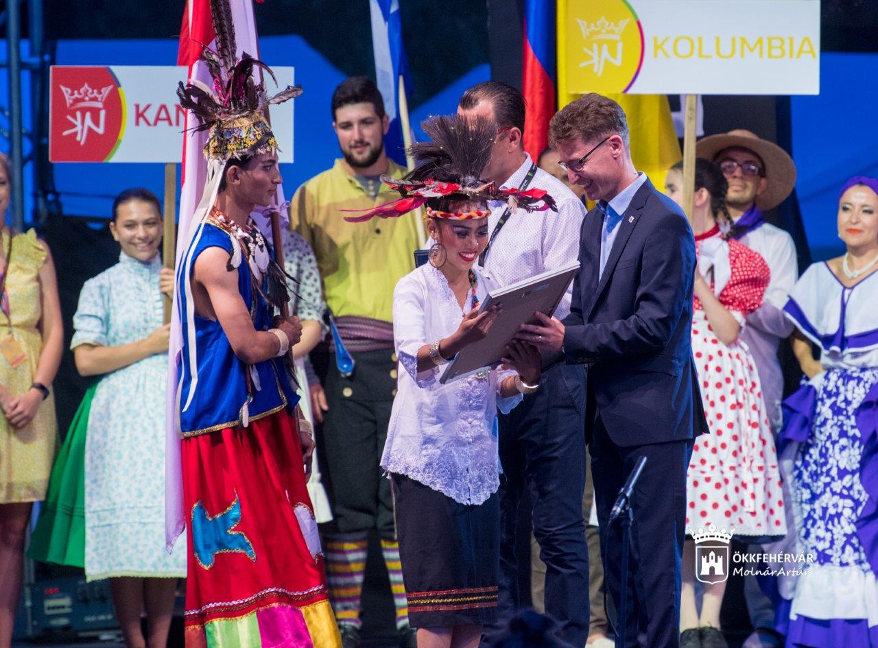A parádés előadás előtt dr. Cser-Palkovics András polgármester köszönte meg a csoportok idei részvételét, majd Majoros Andor fesztiváligazgató vehette át a jövőre 25 éves fesztivál jubileumi óriáslogóját.
