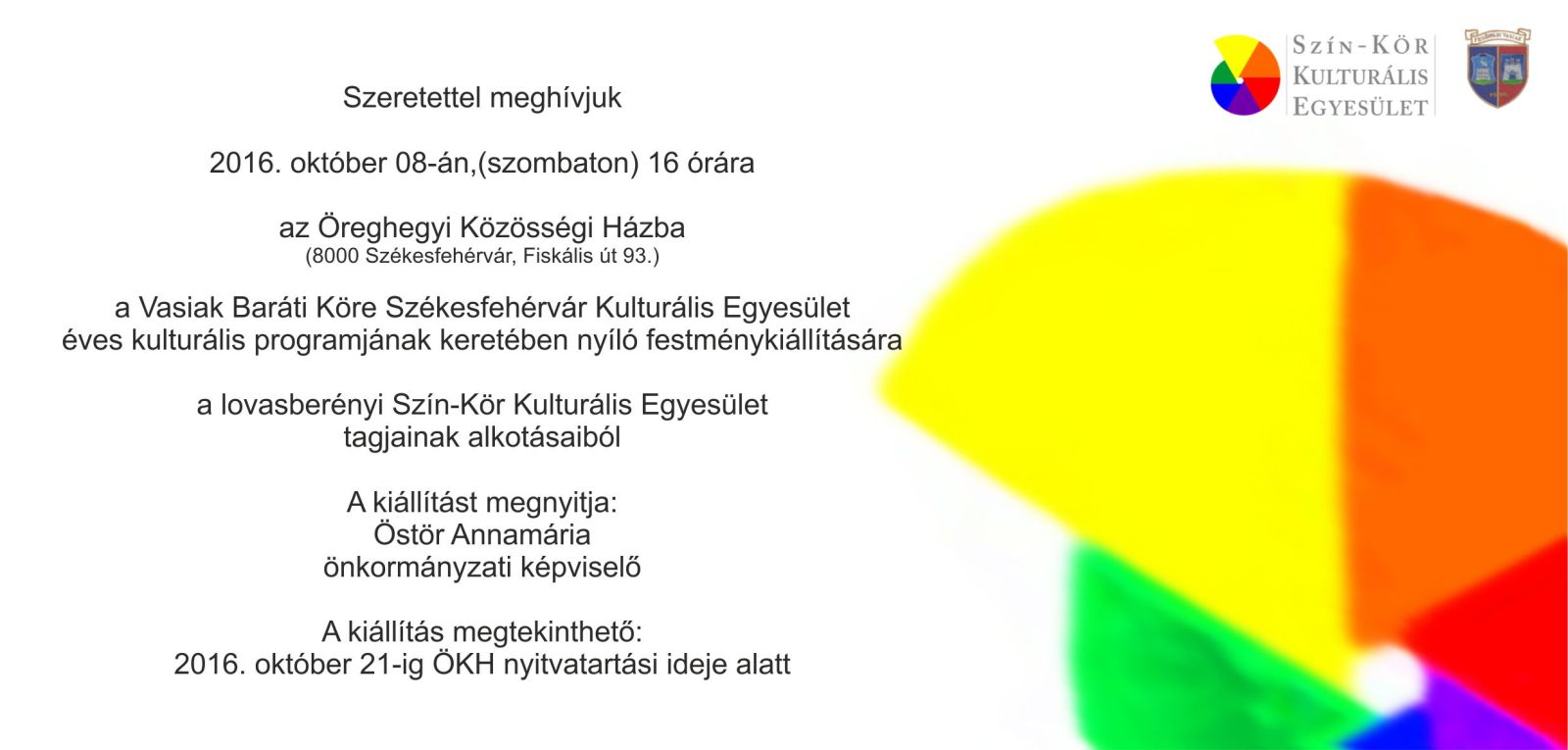 Október 8-án, szombaton 16 órakor a Vasiak Baráti Köre szervezésében a lovasberényi Szín-Kör Kulturális Egyesület tagjainak alkotásaiból nyílik kiállítás az Öreghegyi Közösségi Házban. A tárlatot Östör Annamária önkormányzati képviselő nyitja meg, a kiállítást október 21-ig láthatják az érdeklődők az ÖKH nyitvatartási idejében.