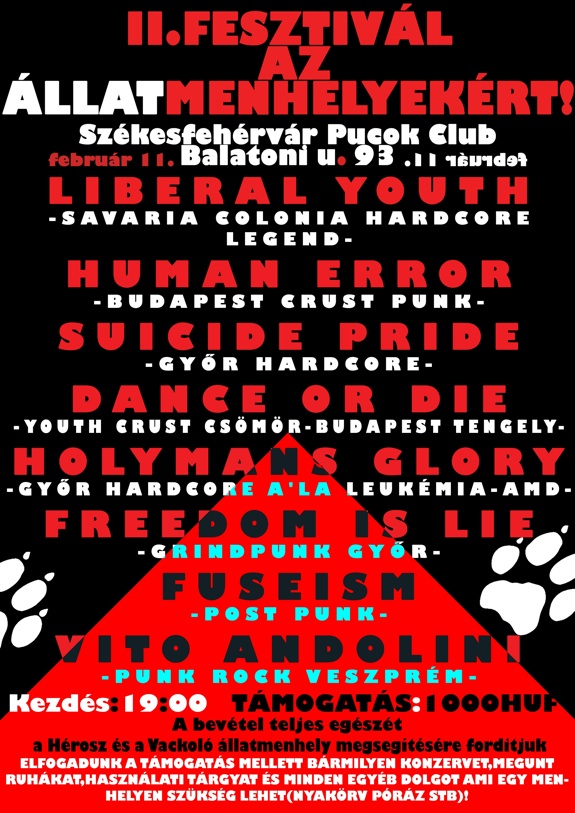 Február 11-én szombaton másodszorra rendeznek fesztivált az állatmenhelyekért a Balatoni út 93. szám alatt található Pucok Underground Clubban, ahol a székesfehérvári HEROSZ és a veszprémi Vackoló állatmenhelynek gyűjtenek. A helyszínen vegan büfé üzemel majd becsületkasszával, ennek bevétele is a menhelyeké lesz. A koncertek 19 órakor kezdődnek, a támogatás 1000 Ft-ba kerül.