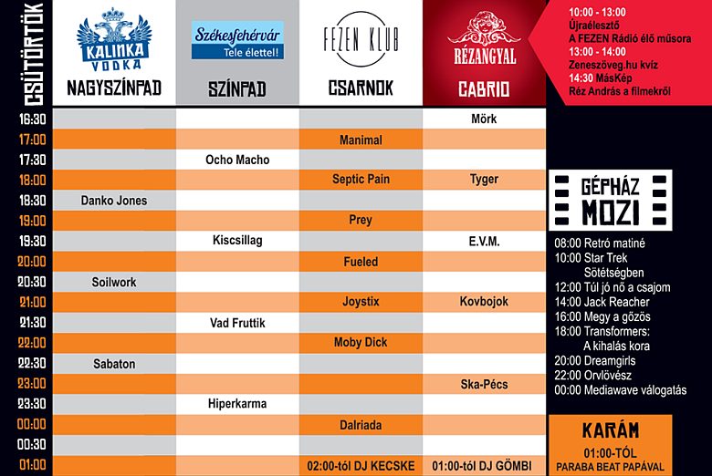 Szerdán kezdődik a FEZEN, de sátrakkal már kedden is be lehet menni a fesztiválkempingbe és az első napon már 10-kor lesz kapunyitás. Ritka zenei élményben lehet részünk Fehérváron, hiszen a legendás heavy metal zenekar, a Judas Priest nyitja a FEZEN négynapos programját. Július 31-én, pénteken csak hazai előadók lépnek fel: a FEZEN nagyszínpadán Ákos, a Magna Cum Laude és a Hooligans is ott lesz de Fehérváron ünnepli 25 éves fennállását a Sex Action is.