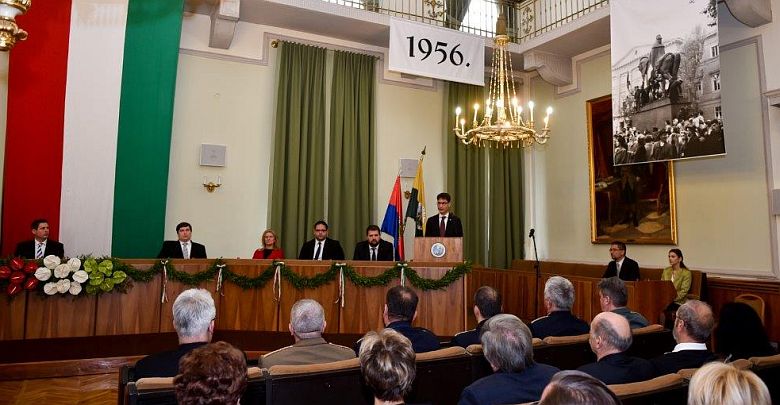 Az ünnepi ülés a Himnusz hangjaival kezdődött a Megyeházán a Vox Mirabilis Kamarakórus előadásában, majd dr. Molnár Krisztián, a Fejér Megyei Közgyűlés elnöke mondta el ünnepi beszédét, amelyben kiemelte, hogy a magyar nemzet ezer év alatt megtanulta, hogy a szabadságról, a hazáról nem elég csak beszélni. „Ezekért harcolni kell, és tenni a békés hétköznapokban is. Megtanultuk ezt, és emiatt vagyunk ma itt, Európa szívében, az ezeréves magyar államban. És tegyük hozzá azt is, talán éppen ezért lehet még itt, viheti tovább kereszténységben gyökerező hagyományait, értékeit egész Európa is.” – fogalmazott a Fejér Megyei Közgyűlés elnöke. „Úgy tűnik, ezeken a végeken emberöltőről emberöltőre meg kell az országot védeni. Európa szerencsésebb részein ezt gyakran nem értik, hisz nekik több száz éve eleve adott ez a szabadság, sok-sok nemzedék óta nem kellett küzdeniük érte.” – tette hozzá. „Köszönjük 1956 forradalmárainak, hogy tetteik, a nemzet iránti elkötelezettségük még ma is, több mint fél évszázad múltán is zsinórmértékként szolgálhatnak utódjaiknak! A legkevesebb, amit mi tehetünk, hogy igyekszünk méltók lenni hozzájuk!” – zárta gondolatait dr. Molnár Krisztián.