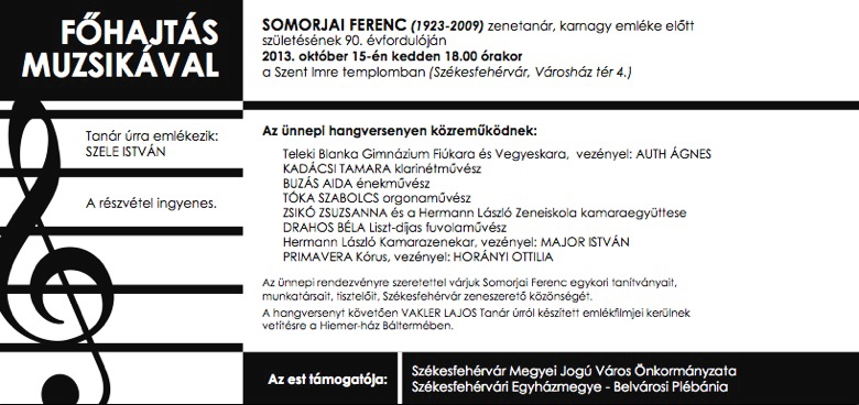 Hang- versennyel emlékezik Fehérvár Somorjai Ferenc zenetanárra, karnagyra október 15-én kedden 18 órakor a Szent Imre templomban. Az ünnepi rendezvényre szeretettel várják Somorjai Ferenc egykori tanítványait, munkatársait, tisztelőit és a város zeneszerető közönségét.