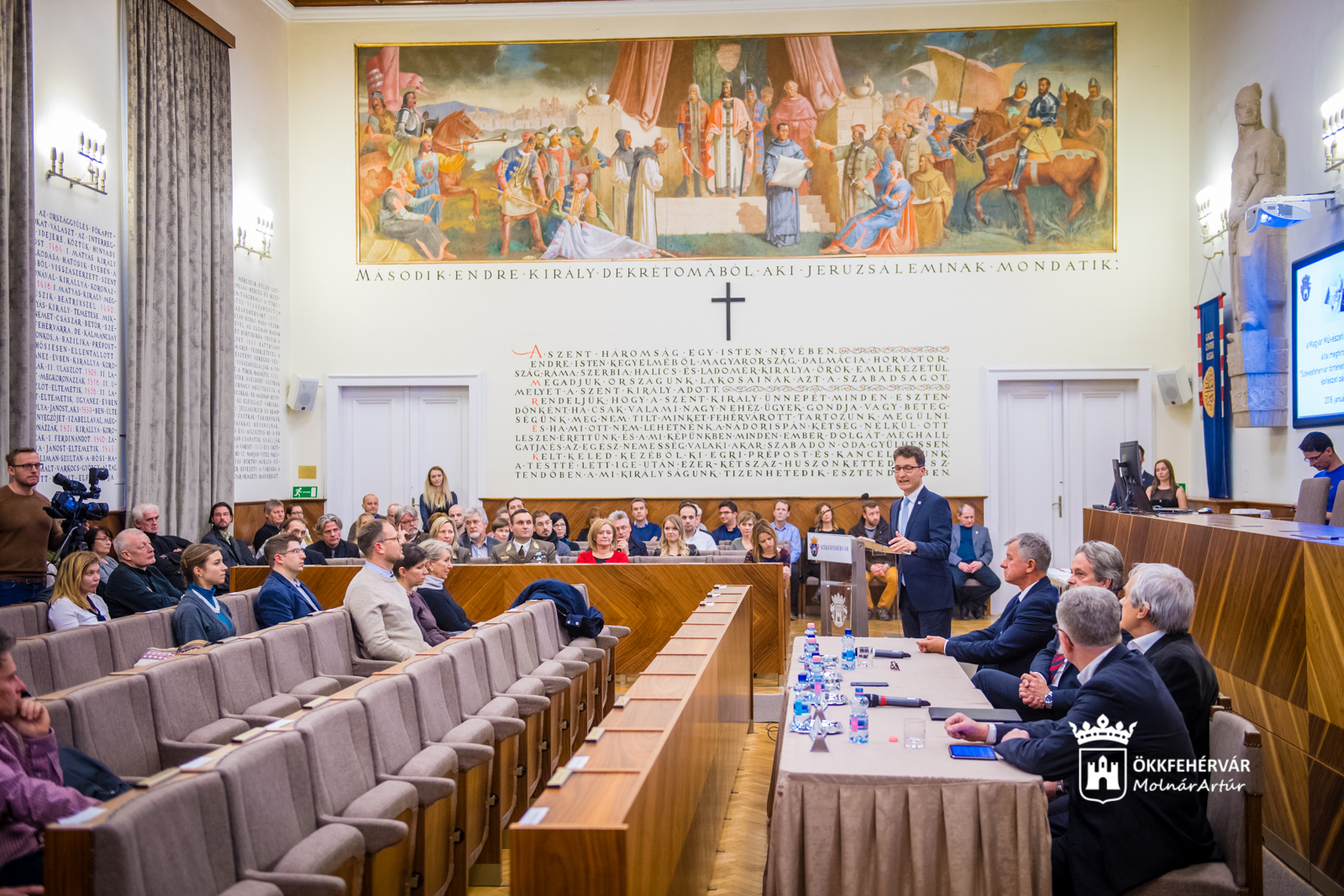 Egy nagyon nehéz feladatra vállalkozott a művészeti akadémia és a pályázók is – mondta Cser-Palkovics András köszöntőjében, majd a város nevében megköszönte, hogy ismét egy fehérvári témát választottak.