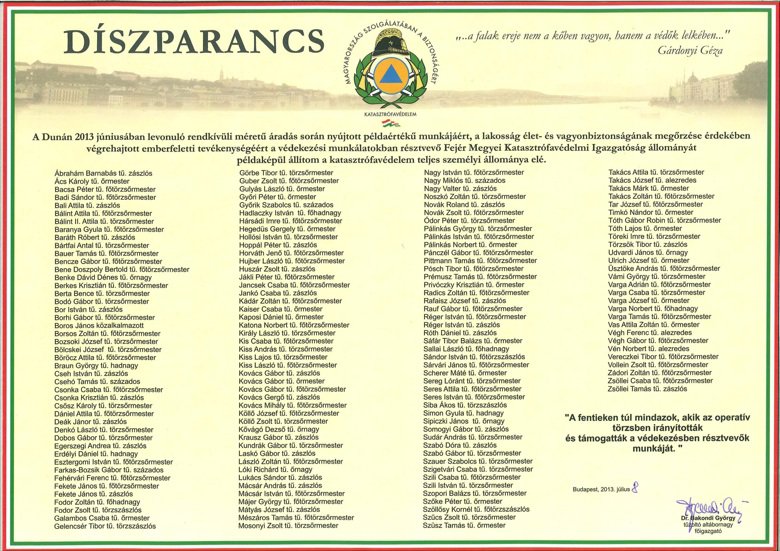 A Dunán 2013 júniusában levonuló rendkívüli méretű áradás során nyújtott példaértékű munkáért a védekezési munkálatokban résztvevő Fejér Megyei Katasztrófavédelmi Igazgatóság állományát példaképül állítja a katasztrófavédelem teljes személyi állománya elé az a díszparancs, amelyet dr. Bakondi György, a BM Országos Katasztrófavédelmi Főigazgatóság főigazgatója adott ki.