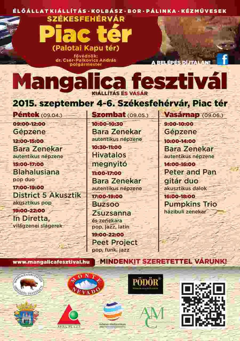 Székesfehérváron negyedik alkalommal rendezik meg a Mangalica Fesztivált szeptember 4-6-a között, péntektől vasárnapig a megszokott helyszínen, az Alba Plaza előtti téren. Az árusítás mellett színpadi produkciókkal is készülnek a szervezők, lesznek a fesztivál hangulatához illő népzenei előadások, gasztro bemutatók, vásári komédia, kora délutántól könnyűzenei koncertek, az árusító helyek melletti karámokban pedig három mangalica fajta, a szőke, a vörös és a fecskehasú egyedeit élőben tekinthetik meg az érdeklődők. A IV. Székesfehérvári Mangalica Fesztivál naponta 09.00 órától 22.00 óráig várja a látogatókat.
