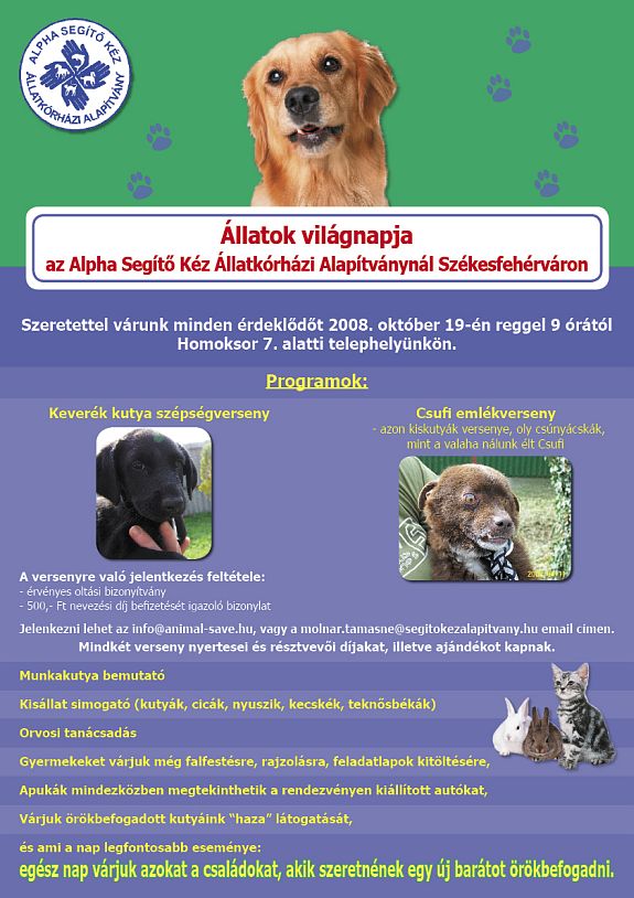 Egész napos programokkal vár minden kedves érdeklődőt az Alpha Segítő Kéz Állatkórházi Alapítvány október 19-én, vasárnap a Homoksoron. A keverék kutya szépségversenyen kívül lesz munkakutya bemutató és kisállat símogató illetve állatorvosi tanácsadással is várják az állatszerető közönséget. Azokat a családokat is várják, akik örökbefogadnának gazdátlan kutyákat. A program az Állatok Világnapjához kapcsolódik. Mindenkit szeretettel várnak!