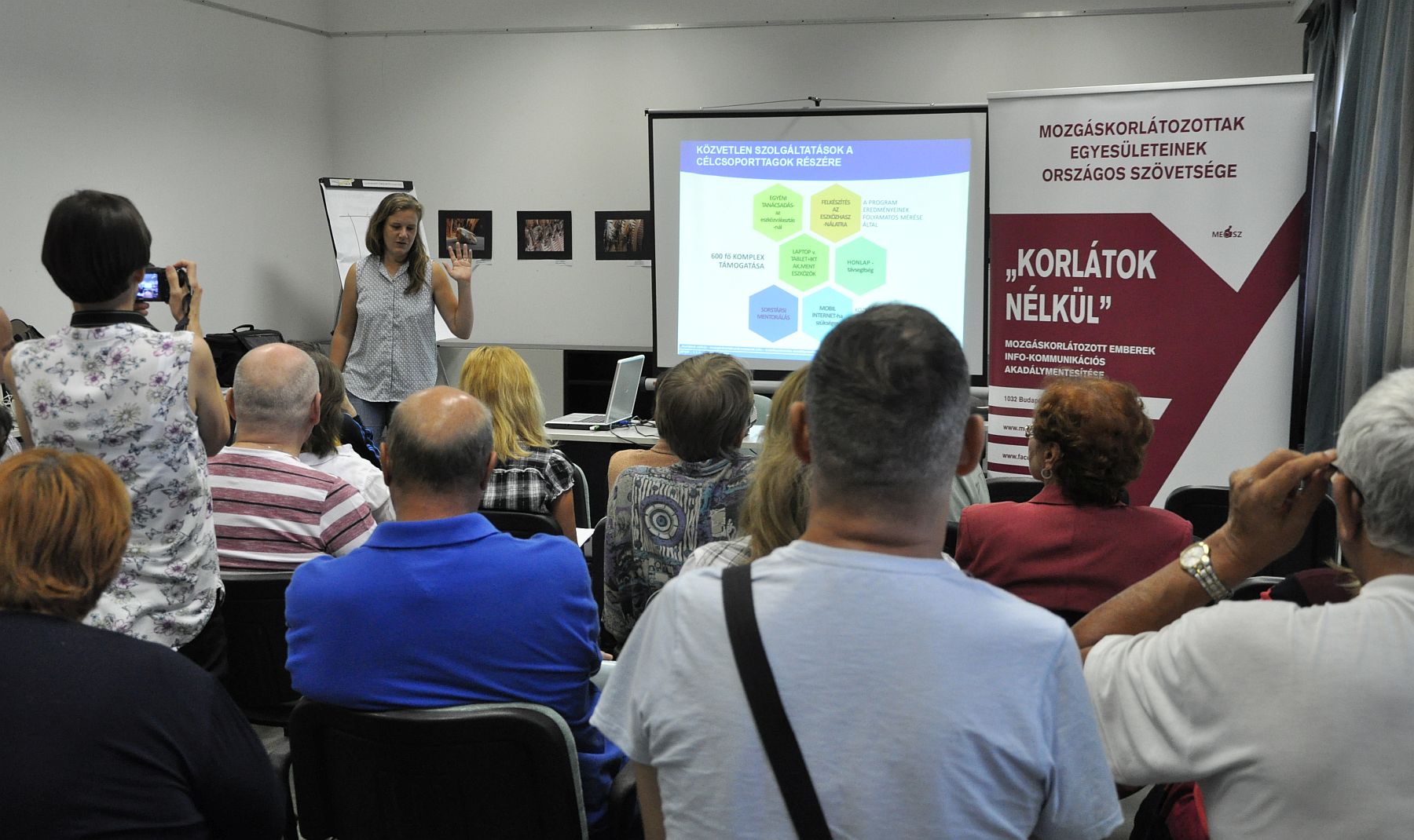 „A Mozgáskorlátozottak Egyesületeinek Országos Szövetsége (MEOSZ) megyénként átlagosan 30 mozgáskorlátozott személynek tud segítséget nyújtani a pályázat keretében, így keressük azokat az aktív korú mozgáskorlátozott embereket, akik az adott megyében dolgozó mentorokkal együttműködve a mindennapokban tesztelik azokat a személyre szabott infokommunikációs eszközöket, amelyek segítségével önállóan tudnak ügyeket intézni, így önrendelkező életet élni. Olyan mozgáskorlátozott emberek jelentkezését várjuk, akik gyakran vesznek igénybe közszolgáltatásokat és az eszközhasználat során visszajelzést tudnak arról adni, hogy hol ütköznek környezeti akadályokba.” - tájékoztatta a megjelenteket Csizmadia Péter, projektvezető.