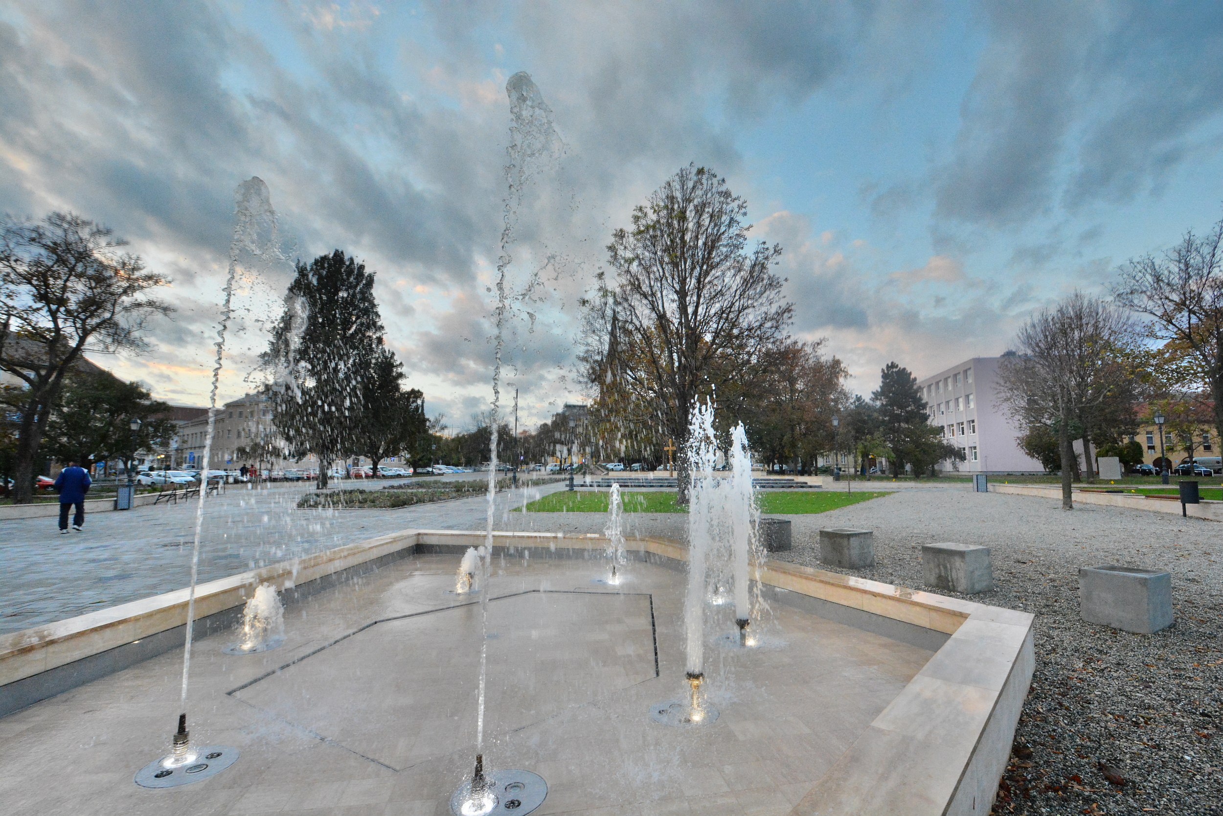 Hivatalosan ugyan tér, de gyakorlatilag egy park. Körben az utat és a járdát felújították, ráadásul több parkolóhelyet is kialakítottak: „A középső rész megszépítése korábban elkezdődött, de az időjárás miatt a munkát csak most lehetett befejezni. Az új virágágyásokon túl a szökőkút is működni fog. A két szobor az alkotó elképzelése szerint vízmedencében állt volna. Ezt az állapotot akartuk visszaállítani, de sajnos a szobrok belsejében lévő csőrendszert már nem lehetett megmenteni, ezért nem belőlük, hanem a medence oldalából folyik majd a víz.”