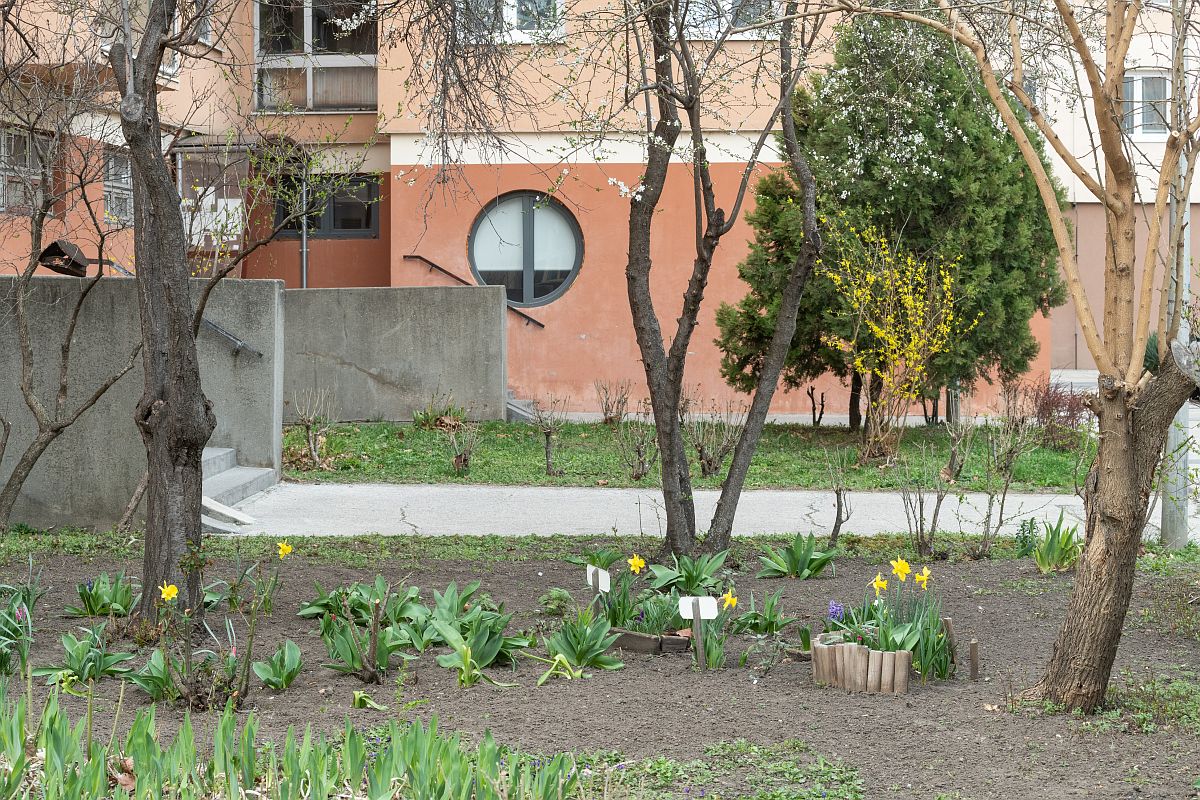 Hétköznapi csendélet: tavaszi kert egy József utcai tízemeletes előtt.