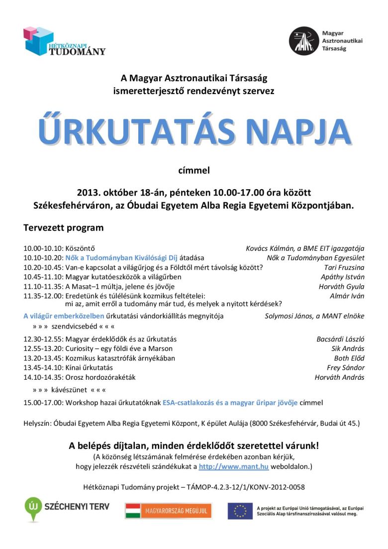 Október 18-án, pénteken 10 és 17 óra között a Magyar Asztronautikai Társaság Ûrkutatás Napja címmel ismeretterjesztő rendezvényt szervez az Óbudai Egyetem Alba Regia Egyetemi Központjában. Az előadásokból többek között kiderül, mi áll a kozmikus katasztrófák hátterében, illetve milyen magyar eszközöket használnak az űrkutatásban.