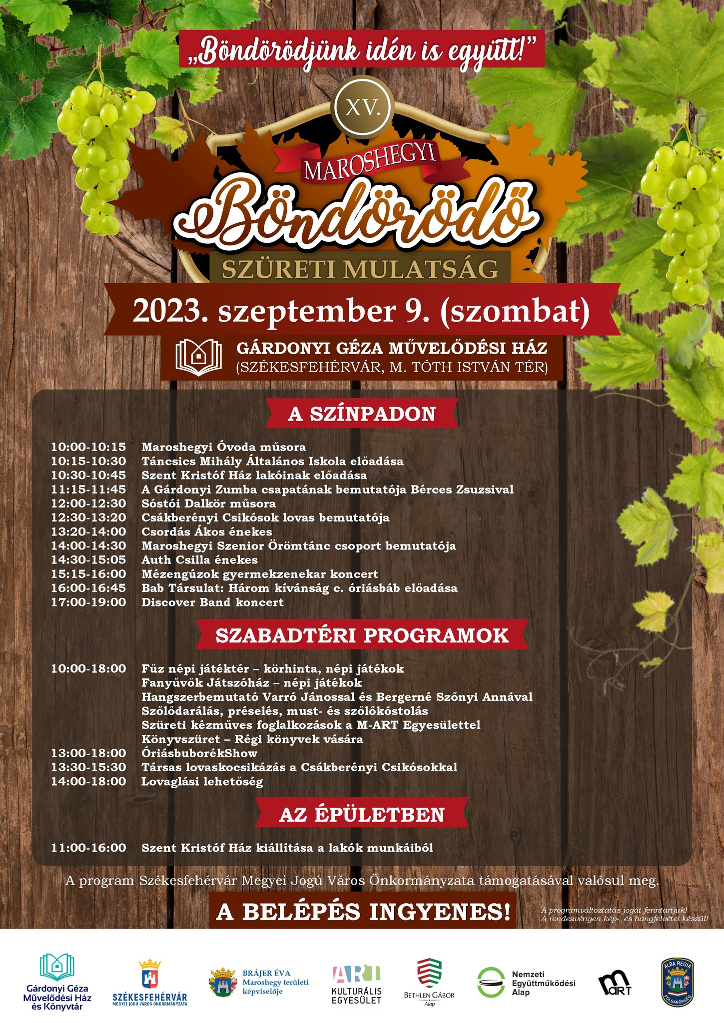A nagyszabású szüreti mulatság keretében bemutatkoznak a helyi művészcsoportok, emellett lesznek koncertek, népi játékok, lovaskocsikázás és sok egyéb vidám, tartalmas elfoglaltság. A főzőversenyen 15 csapat számára tudnak helyet biztosítani. A részvétel ingyenes, szeretettel hívnak és várnak minden érdeklődőt!