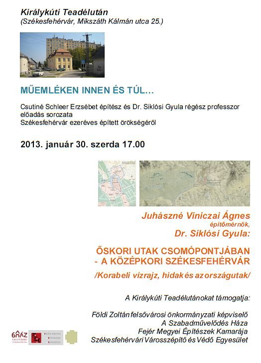 Január 30-án szerdán 17 órakor folytatódik a „Műemléken innen és túl” sorozat a Királykút Emlékházban Székesfehérvár ezeréves épített örökségéről. Ezúttal „Õskori utak csomópontjában - a középkori Székesfehérvár” címmel hallhatnak előadást az érdeklődők Juhászné Viniczai Ágnes építőmérnöktől és Dr. Siklósi Gyula régész professzortól. Az előadás keretében a korabeli vízrajzról, hidakról és országutakról lesz szó.