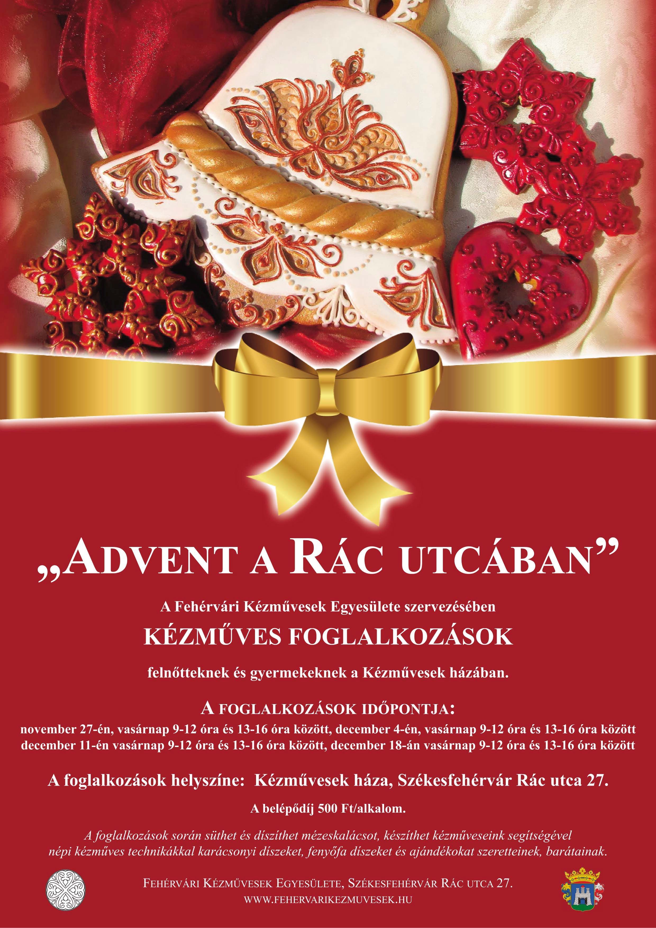Az „Advent a Rác utcában” sorozatot tavaly rendezte meg első ízben a Fehérvári Kézművesek Egyesülete, a foglalkozások nagy sikert arattak a fehérvári családok körében. Idén ismét elindították a kezdeményezést, melynek keretében Advent minden vasárnapján, délelőtt 9-12.00 óra között, míg délután 13.00-16.00 óra között tartanak családi kézműves foglalkozásokat a Rác utca 27. szám alatti Kézművesek Házában. A résztvevők süthetnek és díszíthetnek mézeskalácsot, és az egyesület alkotóinak segítségével, különféle népi kézműves technikákkal készíthetnek karácsonyi díszeket, fenyőfa dekorációkat és ajándékokat a szeretteiknek, a barátaiknak.