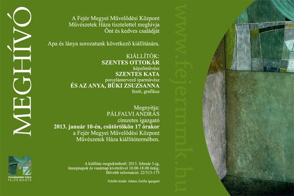 Január 10-én csütörtökön 17 órakor nyílik meg az Apa és lánya sorozat újabb kiállítása a Művészetek Házában. Ezúttal Szentes Ottokár képzőművész, Szentes Kata porcelántervező iparművész és Büki Zsuzsanna festő, grafikus alkotásait ismerhetik meg az érdeklődők. A tárlat február 3-ig tekinthető meg vasárnap és ünnepnapok kivételével naponta 10-18 óráig.