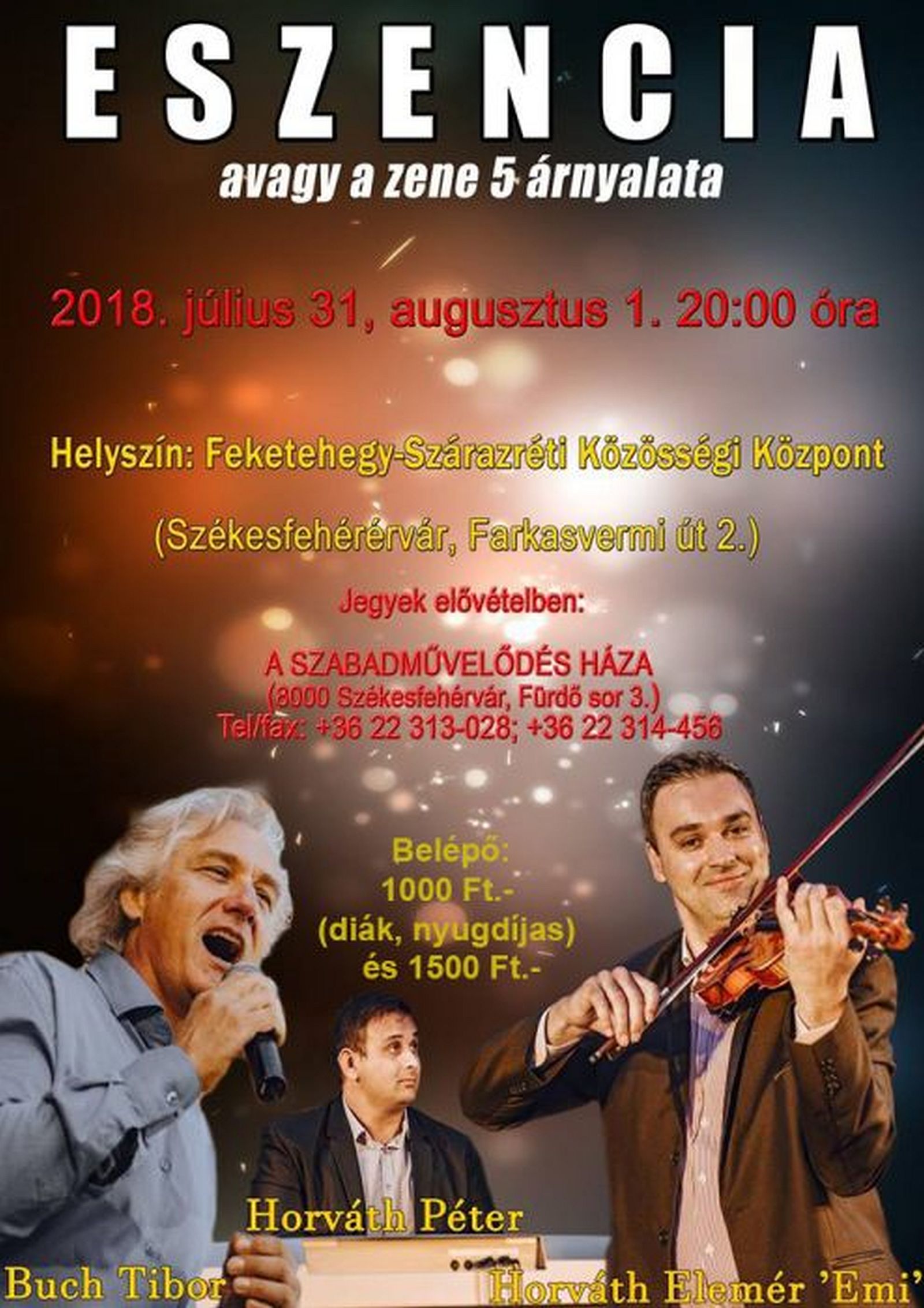 Július 31-én, kedden és augusztus 1-jén, szerdán mutatják be az Esszencia, avagy a zene 5 árnyalata című előadást a Feketehegy-Szárazréti Közösségi Központban. „Ez annyit jelent, hogy öt különböző zenei stílust mutatunk be ezen az estén; a klasszikus komolyzenét, a filmzenét, operettet, musicalt és a magyar nótát. Ezt az előadást januárban a Vörösmarty Színház is bemutatta, a vendégművész Buch Tibor.” - emelte ki Horváth Elemér, hegedűművész.